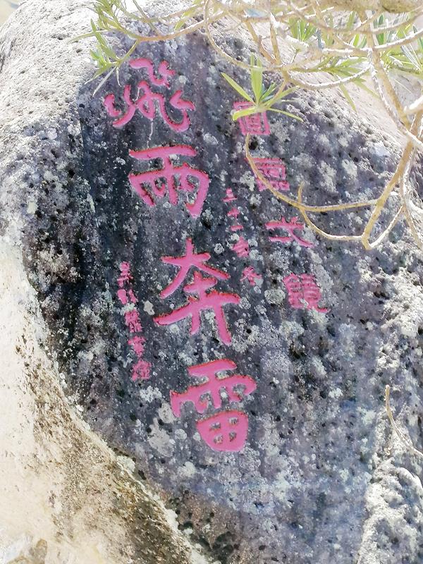 近代的墨客题写的“飞雨奔雷”为竖式行书镌刻,字径18厘米,笔锋俊俏有力,笔势苍劲挺拔;落款:吴县严家淦。“道家蓬莱”为竖式楷书镌刻,字径20厘米;落款:仙水龟城陈学礼施财立。