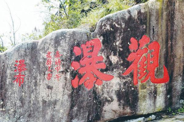 明代李翱题写的“观瀑”为横式楷书镌刻,字径70厘米,落款摩崖石刻字迹剥蚀,难以辨认。据仙游旧志载:明代李翱书。据传,李翱任职兴化同知期间,经常到观瀑亭一边观瀑一边习字,练其气势,练其构架,练其意韵,书法功力日益猛进。