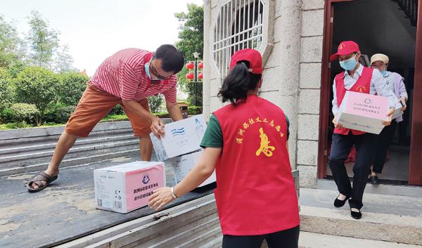 9月16日上午,湄洲妈祖慈善基金会工作人员和祖庙妈祖义工们将一箱箱矿泉水和一袋袋妈祖糕搬到车上,将湄洲妈祖祖庙董事会的关怀送往岛内隔离点。据悉,这是继9月15日向岛内各个核酸采集点捐赠爱心物资后,祖庙董事会再次行动。