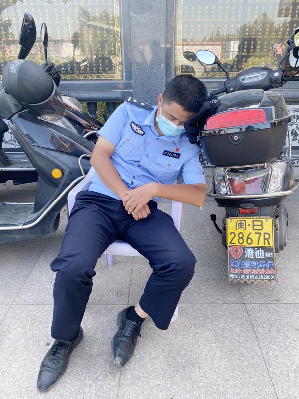 本报讯 “嘘,让他多睡一会儿,连续几天都没好好休息过了。”坐着等待下一场的核酸检测间隔,困极了的他倚着旁边电动车睡着了。这是近日东庄派出所民警郑德武在核酸检测点被拍到的一幕,他的同事不忍心叫醒他。不过即使多睡一会儿,也只不过短短的20分钟,很快,他便转战下一场的防控安保。(张伟)