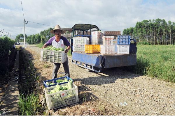 来自莆田荔城区新度镇蔬菜种植户郑建成在大济镇莆山村投资承包耕地种植香菇豆、台湾丝瓜、大白菜各种有价值蔬菜产品12多公顷,他采用科学种植、科学管理、科学施肥,没有农药残留,纯属绿色生态无公害产品。近期台湾丝瓜正值采收旺季,每天可采收2500多公斤。每公顷可采收45000公斤,虽然进入秋季,但天气依然炎热,员工们个个满头大汗紧张有序忙着采摘搬运分拣装箱。近期天气依然炎热丝瓜不但丰收市场价格好,在当地城区十分畅销。(陈国松)