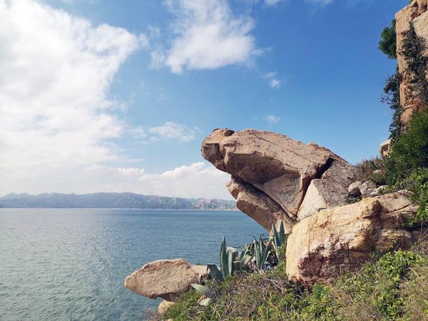 这条路还没完全环岛,据说还要继续修建。走到路的尽头,我们沿着石阶上山,山腰有一块巨石很奇特,清明兄说像湄洲岛鹅尾神石园的“情侣蛙”“盼归蛙”,我仔细一对比,确有几分相似。
