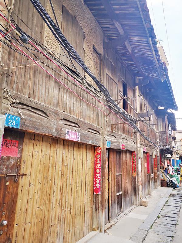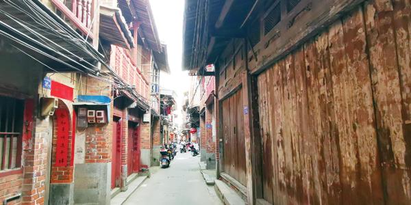 后街,略呈东西走向。与之相对,便是前街。从三角埕到苍头社这段百多米的小街,宽仅四五米,两边以一两层老式建筑为主,泥木结构,剥落油漆的木头和灰浆斑驳的泥墙,刻录了岁月的沧桑。出挑的瓦檐下,路面留下一些细小的孔洞,叙述了时间的长度。