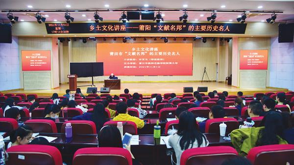 讲座伊始,许老师以《爱我莆田》这套乡土教辅为载体,强调了地方文化学习的重要性。许老师旁征博引,先后阐述了“文献名邦”“海滨邹鲁”两大誉称的确切解读,展现了莆阳悠久的历史文化积淀。