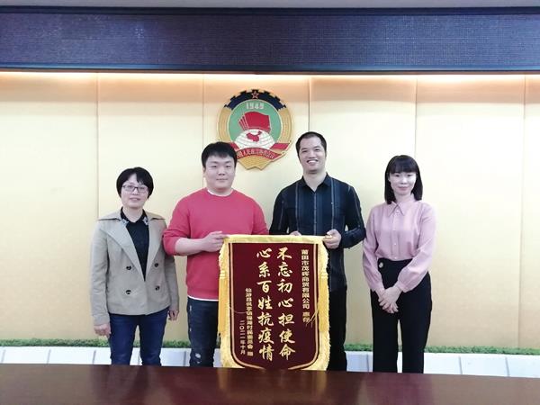 11月10日,疫情期间驻仙游县枫亭镇锦湖村的市人大常委会办公室副主任兰志容和办公室综合研究科副科长郑小舷代表锦湖村民委员会为区政协委员、莆田市茂晖商贸有限公司总经理何冠福送来了一面锦旗,上面写着“不忘初心担使命 心系百姓抗疫情”,以此感谢政协委员何冠福在疫情期间对锦湖村疫情防控工作的支持,何冠福共捐赠了喷雾酒精900瓶、口罩6000个、面包蛋糕300件和农夫矿泉水100件,帮助锦湖村解决了物资紧缺的燃眉之急,彰显了政协委员的情怀和风采,赢得了锦湖村干部群众的一致好评。同时也感谢涵江区政协给委员搭建了一个很好的平台,助推委员履职尽责,发挥委员作用,展现新时代政协委员的责任和担当。