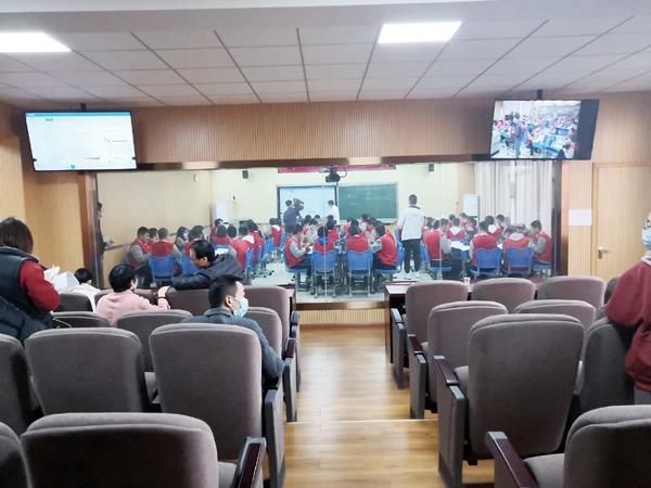 在冯国根老师的政治课堂上,学生们分组而坐,老师导入情境,学生们认真看笔记、小组讨论、回答提问、用智慧平板抢答……课堂交流中,交流互动、评价反馈即时化,每个学生都可以说出独特见解,同学可以补充。教室后的玻璃幕墙连接起隔间的观摩室,实时投映上课现场和课件。