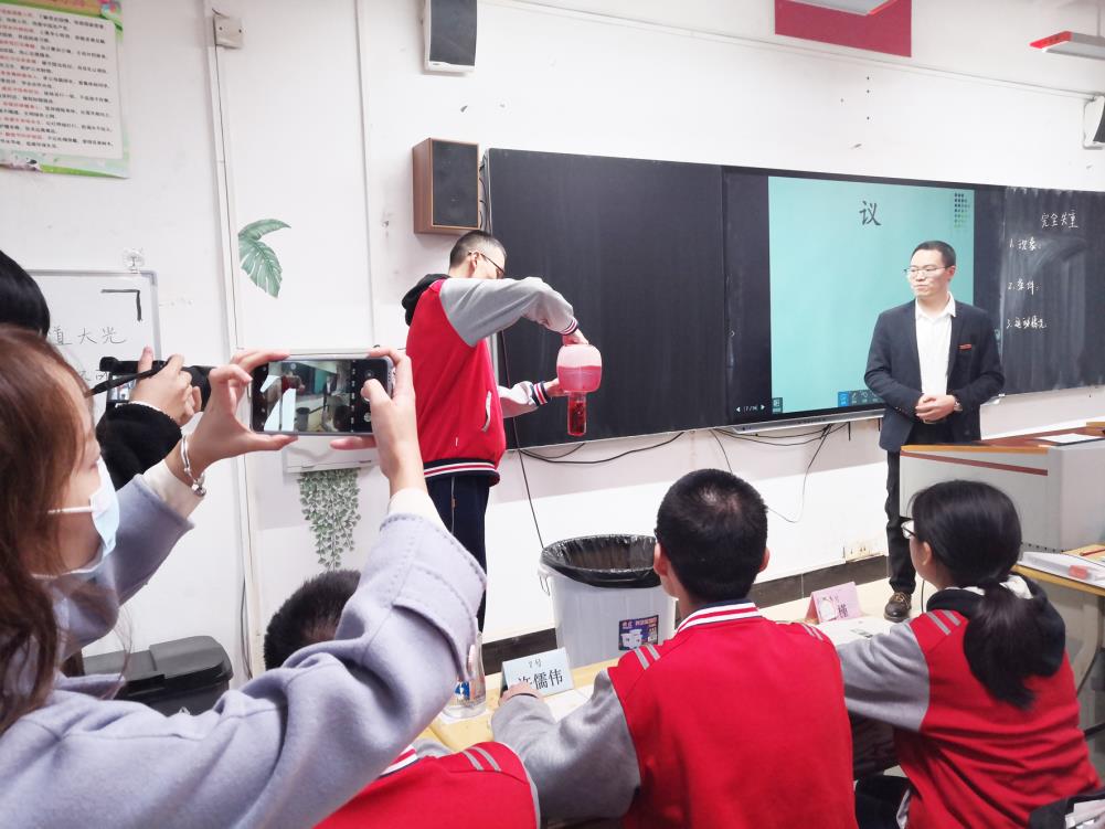 李光亮老师的物理课堂上的是失重的课题,老师导入情境,让学生将装上液体的扎孔瓶子作自由落体实操实验,学生们认真观察,小组讨论,组间质疑……