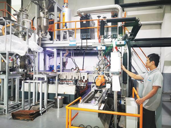 本报讯 将原料珠粒注入机器,形成发泡颗粒,再经过热压成型生产出鞋中底……近日,记者在福建鑫瑞新材料科技有限公司生产车间看到,每一条生产线都在忙碌运行着。而在实验室里,工作人员也通过仪器检测材料的流变点、密度、重量及产品的性能等。