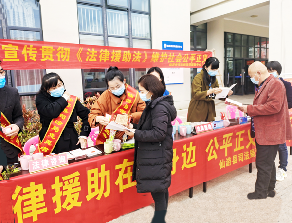 本报讯 为了让群众广泛知晓即将于2022年1月1日施行的《中华人民共和国法律援助法》,贯彻落实“谁执法?谁普法”普法责任制,12月24日,仙游县司法局法律援助中心于县行政服务中心门口开展《法律援助法》宣传活动。县司法局干部、县法律援助中心、公证处工作人员及律师代表参加。