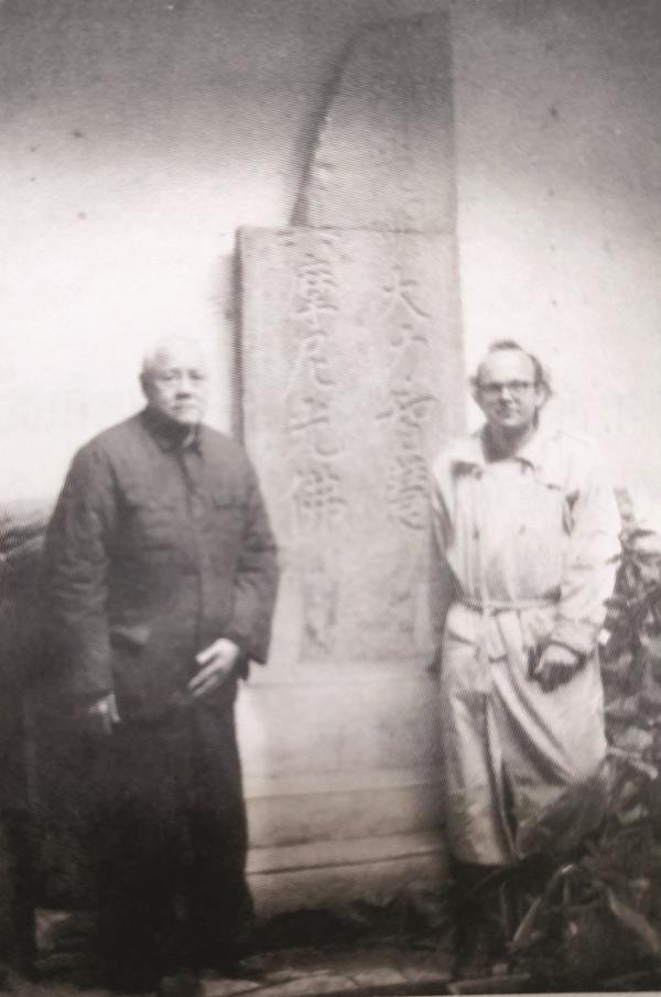 陈长城(左)在发现的碑刻前与世界摩尼教专家合影(陈鉴湖供稿)