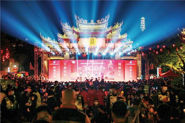 夜幕下的祖庙山,张灯结彩,溢彩炫幻。当天晚上8时,以“千秋妈祖·锦绣年华”为主题的湄洲妈祖祖庙2022年新年联欢晚会正式拉开帷幕。晚会以1960年之后的各个年代青春印记为轴,分“春华秋实”“不负韶华”“风华正茂”“锦绣年华”四个篇章,形式多样,内容丰富。