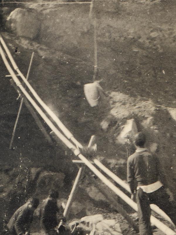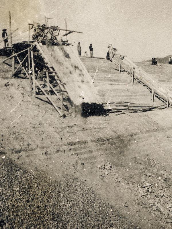 石滚碾压法、铁轨翻斗车、竹轨滑土法、自制木质拌灰机、木槽滑石法、空中送土法等新工具、新方法提高了施工效率。(图片/莆田市东圳水库管理局提供)