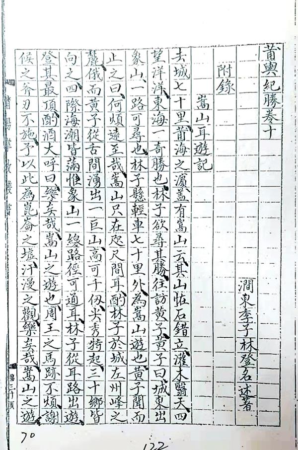 林登名《莆舆纪胜》一书,出版至今已逾四百周年矣。鉴于其在莆田文化史上的独特价值和重要地位,为莆阳文脉珍贵的一环,一个鲜明的符号。特予整理出版,以广流传,并借以告慰作家“莆田徐霞客”林登名的在天之灵。
