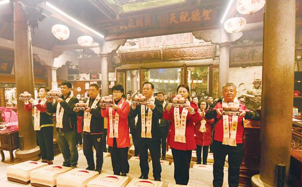 家宴结束后,市政府副市长、湄洲岛党工委书记林韶雯,湄洲妈祖祖庙董事会董事长林金赞陪同留岛台胞前往祖庙参加迎新春活动,并一同向妈祖行庄严的三献礼,感受湄洲岛浓浓的节日气氛。