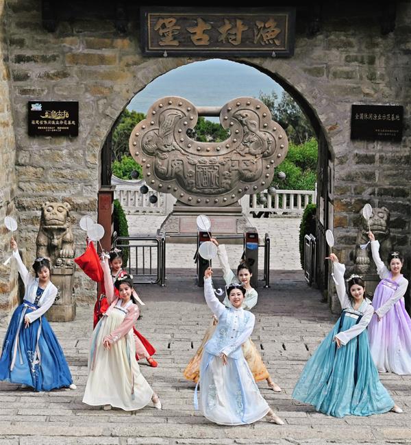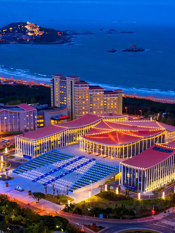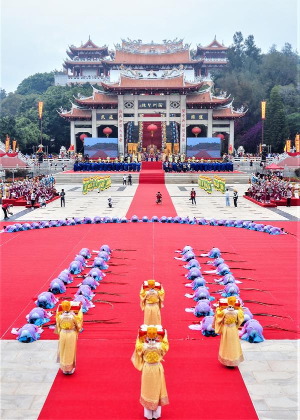 以湄洲妈祖祖庙为背景的歌舞秀实景演出,呈现浓郁的湄洲风情、虔诚的妈祖信俗和庄严的妈祖祭典。(摄影/高亚成)