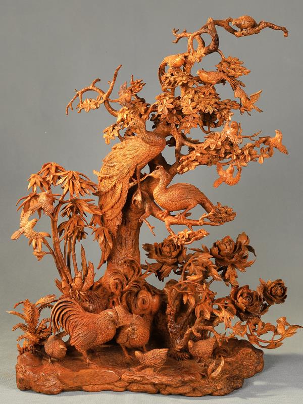 仙游竹雕技艺传承自莆仙传统的精细木雕技艺,移木接竹,创新求变,善于利用竹根的自然形态,创作出构图饱满、浑厚质朴的作品,在方寸之间雕刻山水、人物、楼阁、鸟兽,又施以独特的仿古涂饰,达到仿古胜古的艺术效果。(图片/王新明)