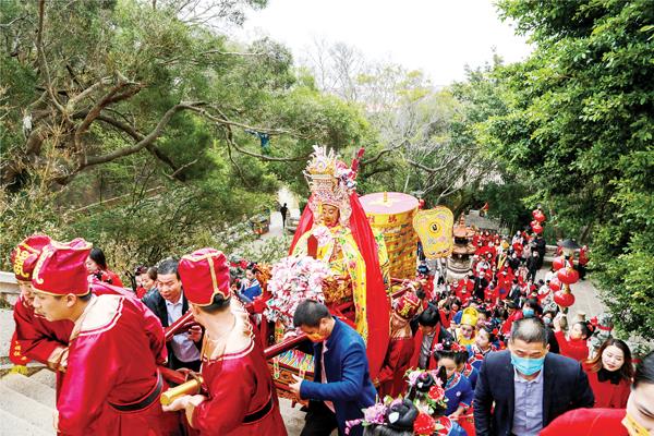 两岸同胞相聚湄洲,同谒妈祖共庆元宵。10日上午9时许,在两岸宫庙代表、妈祖信众的簇拥下,妈祖金身缓缓起驾,开始本次返乡省亲布福。舞龙队、车鼓队、仪仗队、仪卫队等特色民俗阵头组成浩浩荡荡的队伍,从妈祖祖庙出发,沿着湄洲大道向天妃故里遗址公园行进,沿途吸引了众多群众、游客夹道欢迎和驻足观看,妈祖金身所经之处,家家恭迎圣驾,户户焚香祷告。上午10时许,队伍抵达天妃故里遗址公园,祖庙董事会依照东蔡村接妈祖闹元宵习俗举行接驾仪式,恭请妈祖金身驻跸妈祖故居。“这是我第一次在湄洲岛体验元宵氛围,对‘十里不同风,一村一习俗’这句话有了切身体会,也再次感受到了同胞的热情与关怀,心里倍感温暖。”在现场,来自台湾省彰化县福兴乡皇圣宫副主委陈清鋐说。