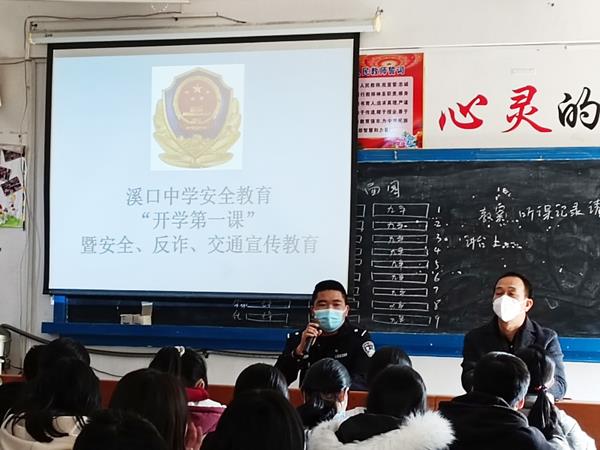本报讯 2022年2月16日,是学校正式开学的第一天。为做好校园安全稳定工作,及时消除安全隐患,加强校园安全管理,严防各类安全事故的发生,社区民警蔡建凡,开学第一天便深入辖区内溪口学校进行安全检查,并为学生送去反诈、禁毒、交通安全知识宣传课!