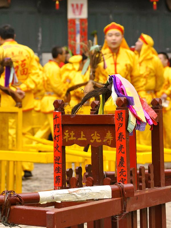 在特制的轿子顶部绑上棕叶,贴上象征不同姓氏、不同村落的神符。(摄影/姚振汉)