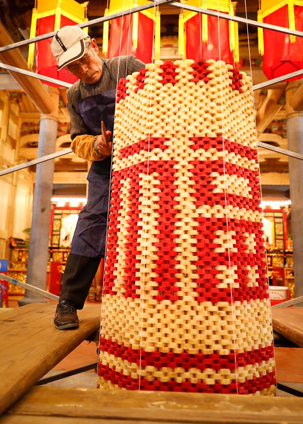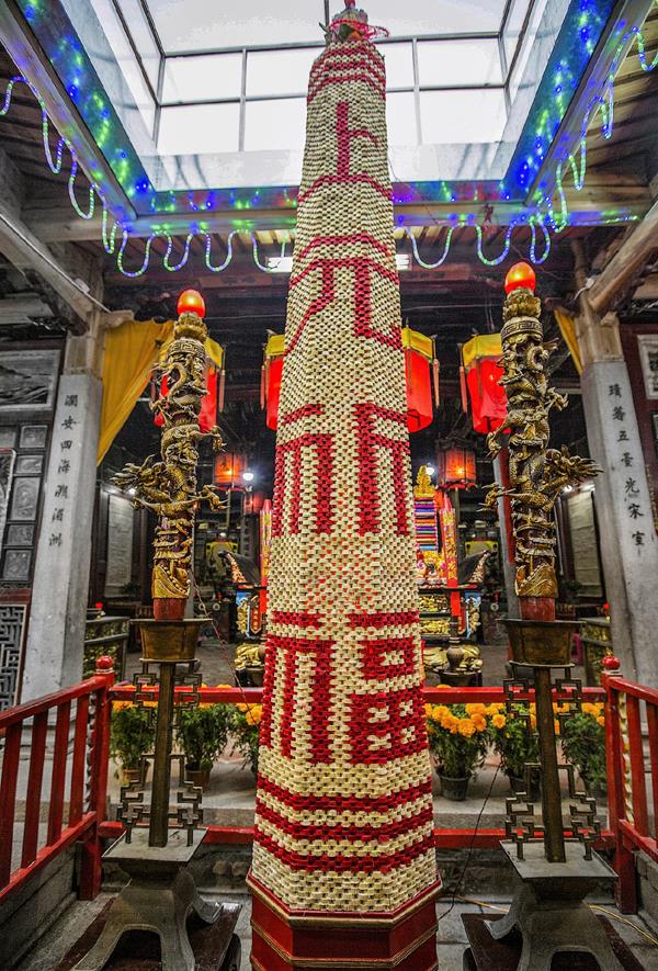 相传妈祖为了救海难,焚屋引航,但仍有未归的船只,妈祖砍自家甘蔗点燃,甘蔗糖分高火焰升得也高,船只见到火光后顺利返航。因此,延宁宫用甘蔗搭建“灯塔”来纪念妈祖(摄影/佘琦辉)