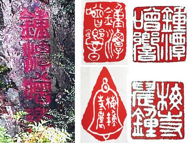 “钟潭噌吰”景点位于今城厢区霞林社区水磨坑。“钟潭”之“钟”的繁体为“鐘”,今门坊“鐘潭风景区”繁体无误,但摩崖石刻“鍾潭噌響”则有误。据明代《莆舆纪胜》载钟潭之名是因相传“古有鐘飞入”,此“鐘”为鐘鼓之“鐘”,而非“酒鍾”或“鍾聚”之“鍾”。故一些篆刻及山上“得月亭”柱联下联“鍾潭映月伴遊人”之“鍾”字皆误。按“钟”的繁体有两个,须依词义选择。“梅寺晨鐘”也常被人误写作“梅寺晨鍾”。今“夹漈草堂”景点的“草堂胜迹”匾额落款“鐘離松”也是选错繁体,“钟离”为复姓,繁体应作“鍾離”。“噌吰”今人则多称“噌响”,口语虽有“噌噌响”说法,但文言实无“噌响”用法,《四库全书》等古籍库全文检索“噌响”一词结果为0。古人咏钟潭多题为《钟潭噌吰》,如清初岁贡方元俞诗云:“锦亭西向是潭边,激石流湍响接天。入水古钟寻不见,闻声峭壁绝依然。”推测“噌响”造词,可能源于明代陈茂烈“清冽岩泉飞玉屑,噌吰潭响遏歌钟”诗句,此二句今钟潭观音庙刻为廊柱对联。钟潭以瀑布著称,其水源出龟山,经朱坑注入锦亭山西南沟壑之中。溪水突然从一处近30米高的悬崖飞流直下,注入深潭。瀑布撞击深潭,发出洪钟般巨响,故有“噌吰”之称。“噌吰”是象声词,常用以形容钟鼓声。如苏轼《石钟山记》:“余方心动欲还,而大声发于水上,噌吰如钟鼓不绝。”另外还有写作“增响”“层响”的则更为离谱了。