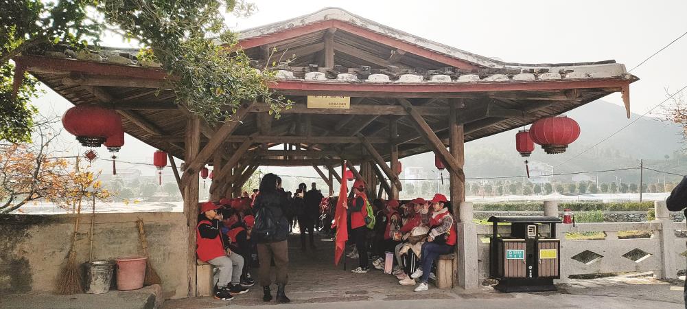建座牢固的通行桥,便成了村民们共同的心愿。清道光二十八年(1848),面对缺乏石料又无钱建石桥的窘境,村里有名望的人发起号召,决定就地取材,利用深山溪谷中的大杉木,择在河床最窄处的村落水口建造这座节省人力物力的木拱廊桥,朴素简单、实用牢固中蕴含营造的古朴灵巧,成为方便两岸居民出行过河的通行主力,而且它可以躲风避雨防晒,天热时,人们总会聚到桥上聊天喝茶,还有不少民间艺人来演奏绕梁不绝的“十音八乐”,让老桥多了一点文化趣味。