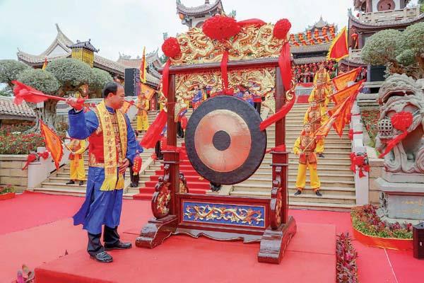 升幡挂灯仪式后,湄洲妈祖祖庙董事会董事长林金赞为“天下妈祖回娘家”启动仪式开锣,随着响亮的锣声响起,11名鼓手同时擂动大鼓,50名旗手随鼓声摇动龙旗。在雄壮的鼓声与飘扬的旗帜里,林金赞董事长引领柳政鸿等11位在岛海峡两岸妈祖敬仰者代表恭请分灵妈祖拾阶走向祖庙天后宫,并在天后宫内举行平安祈福仪式,共同为战胜疫情祈福。