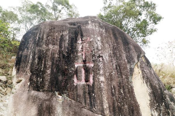 在村民的引路下,我们在“第一山”南麓的一处崖壁上看到,三个楷体石刻大字“第一山”深深地刻在石壁上,显得古朴有力,“明嘉靖辛亥六月朔旦”“诸斋主人廖云龙书勒”的落款分别分布在“第一山”的两边。目前,该石刻已被列入县级文物予以保护。