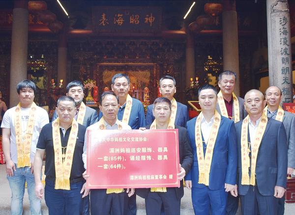 上午10时许,林天佑一行抵达祖庙。湄洲妈祖祖庙董事会董事长林金赞对众人的到来表示热烈欢迎,并陪同众人在祖庙寝殿向妈祖行庄严的三献礼。礼毕,林金赞向加拿大中华妈祖文化交流协会赠送妈祖巡安服饰、器具一套(85件),诵经服饰、器具一套(64件),支持加拿大妈祖文化传播。