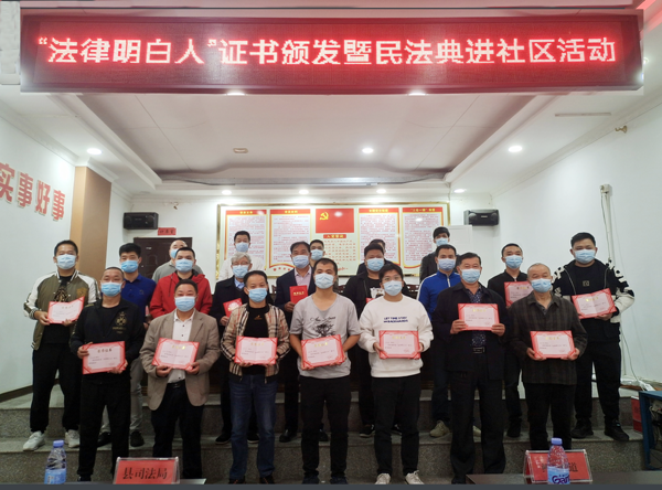为进一步提高基层群众的法律意识,充分发挥“法律明白人”带头作用,5月17日,仙游县司法局联合县农业农村局在鲤城街道木兰社区开展“法律明白人”证书颁发暨民法典进社区活动。