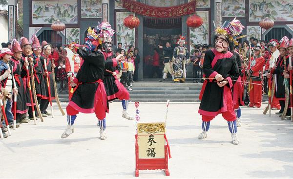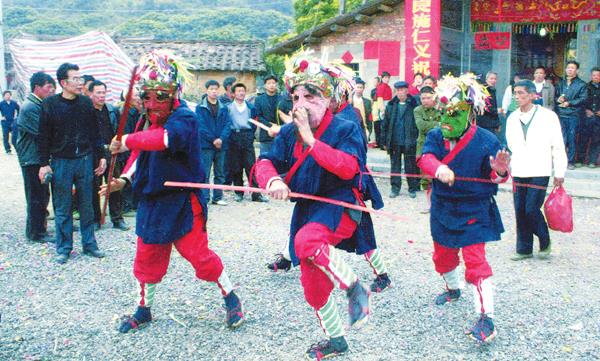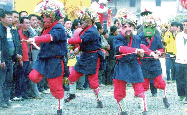 2.麟山宫皂隶舞在长期的民俗活动中,成为当地出游、游灯等各项活动中不可缺少的舞蹈表演,并定形成了一整套规制严格的舞蹈技艺和表演形式。