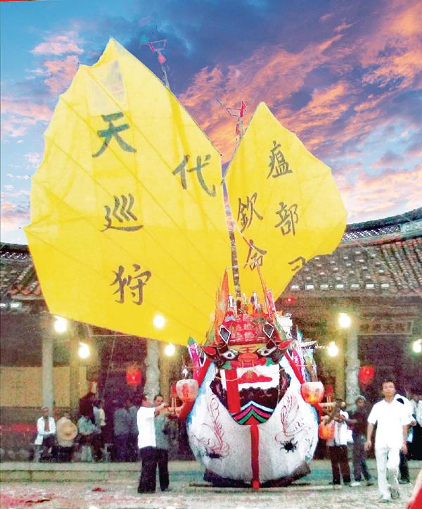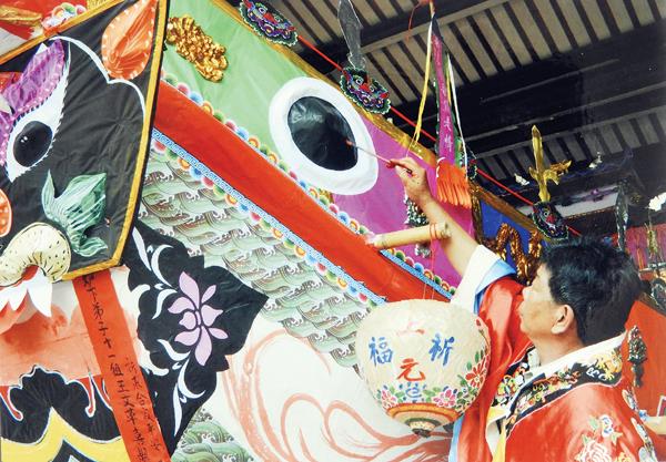 点眼。下午五时,七位法师在顶埕供桌前开始做道场。他们在鼓乐齐鸣声中,念经祷告,穿梭跑场。在神秘而热烈的气氛中,只见一位法师抱着一只大公鸡,领班法师右手执宝剑,左手端瓷碟,在鸡冠上取血,然后二位法师用毛笔蘸着鸡血,庄重而虔诚地分别给龙舟、凤船及神像点眼。龙舟又高又长,点眼时手臂不够长,无法触及。这时聪明的法师就想出一个巧办法,把毛笔绑在一支两米长的竹枝上,增加了长度,顺利点眼。点眼的顺序是从船首到船尾,从船外到船内。令人称奇的是船首高处那尊苏爷,点眼后头会活动,栩栩如生。船上庙宇中的五帝,点眼后好像有了灵性,正在指挥十将和水手驾御龙舟和凤船,驶向大海,驱瘟去邪,保佑信众平安。
