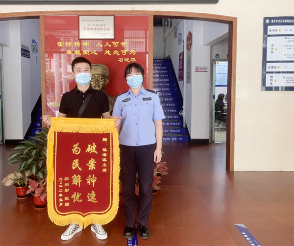 本报讯 5月30日上午,群众杨绍彬先生将一面印有“破案神速 为民解忧”的锦旗送到镇海派出所,对民警一心为民、认真负责,迅速帮其追回共享单车表示衷心的感谢。据悉,4月27日下午,镇海派出所接到杨先生报警称:其扫码共享单车骑行,归还于荔城区镇海中街丰美路口,未还成功,被人误骑两天未还车。民警接警后,第一时间到现场进行调查,结合周边监控循线追踪,于4月29日晚上联系到误骑群众,对方立即归还共享单车。(林芬 陈娟)
