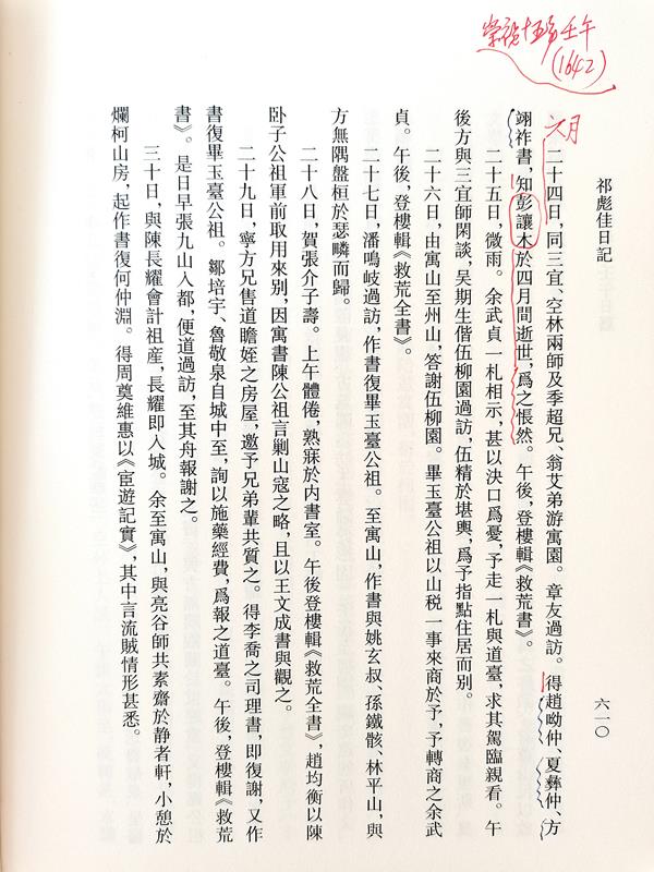 第十二卷《壬午日历》为崇祯十五年(1642)该年日记完整。其中六月二十四的日记一则(第610页)载:“二十四日,同三宜、空林两师及季超兄、翁艾弟游寓园。章友过访。得赵呦仲、夏彝仲[夏允彝(1596-1645),字彝仲,号瑗公。松江华亭(今属上海松江)人,崇祯十年进士,授长乐知县。]、方翊祚(方祖玄,字翊祚,号心冰。莆田方万有孙。崇祯中岁贡生,顺治中官怀远教谕。有《夜光堂诗集》)书(来信),知彭让木于四月间逝世,为之怅然。午后,登楼辑《救荒书》。”从此则日记得知,崇祯十五年(1642)六月二十四日,祁彪佳收到赵呦仲、夏彝仲、方翊仲三位友人来信,告知彭汝楠于四月间逝世,为之怅然。说明彭汝楠于崇祯十五年(1642)四月逝世。其中九月初三日的日记一则(第618页)载:“初三日,入城晤郑鸿逵公祖,缴还粥铺,药局诸册。……至张景岳家求诊脉,日已暮矣,乃归。舟次料理中区各厂饥民册,且为分晰赈赀。作书与彭让木之郎君(指彭汝楠儿子彭士瑛)。”从此则日记得知,崇祯十五年(1642)九月初三日,祁彪佳给彭汝楠之子彭士瑛书信一封。说明祁彪佳在彭汝楠师逝世之后,与其子士瑛还保持书信往来。
