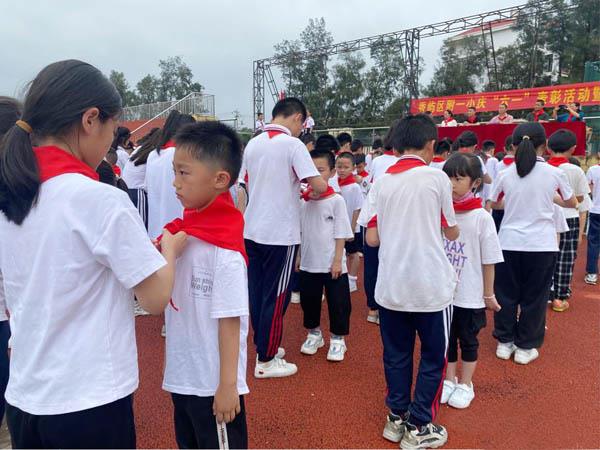 新队员入队仪式在激昂的《出旗曲》中拉开帷幕,出旗曲响起,全体少先队员敬队礼、行注目礼。五年级少先队员代表们为新队员系上红领巾,新队员们佩戴好红领巾,系满理想,神采奕奕,每一个孩子脸上都洋溢着自豪幸福的笑容,享受这光荣的时刻。此次新队员入队仪式,使少先队员们进一步明确了肩负的光荣使命,以实际行动为党的二十大献礼,一起书写更美好的末来。(陈素香)