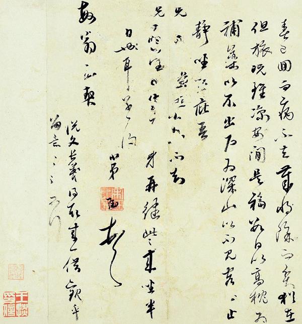 【按】王掞(1645—1728),字藻儒,一作藻如,号颛庵、西田主人、江南太仓(今属苏州)人。王掞是明代首辅王锡爵的曾孙,其祖父王衡万历十六年(1588)顺天府乡试复试第一名,因是首辅王锡爵之子,有言官弹劾主试官,认为有作弊嫌疑。直至王锡爵致仕后,才再入考场,于万历二十九年(1610)廷试榜眼及第,授任翰林院编修。此批二十四札,沈周一札,王鏊一札,祝允明一札,文徵明一札,唐寅二札,王宠一札,文彭一札,王榖祥二札,莫如忠一札,范惟一一札,王穉登一札,梁孜一札,莫是龙一札,董其昌二札,陈继儒三札,宋珏一札,陆应阳一札,俞琬纶一札,王时敏一札。手札的作者多为明中、晚期风云人物,亦是“吴门”和“云间”代表人物。