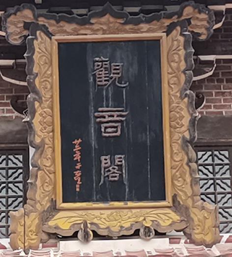 南山广化寺观音阁正门楣上方悬挂“观音阁”竖匾。隶书。署款:“卄二年(1933)于右任。”钤印二方。