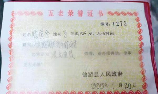 1985年,56岁的陈庆金收到来自政府对“革命五老”的优抚,获得“福建省革命五老荣誉证书”。