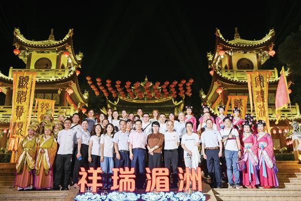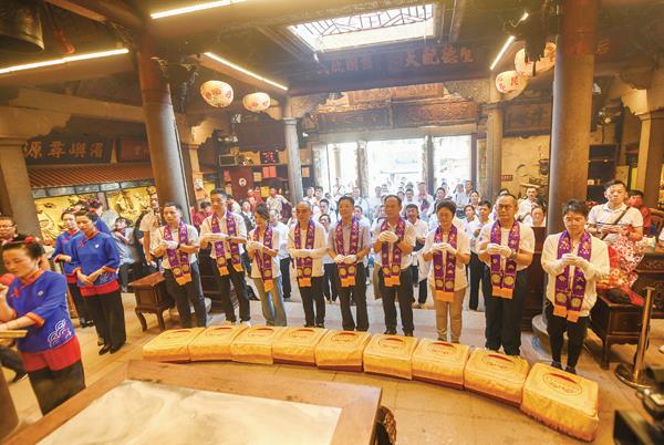 当天上午9时30分,懿明楼前广场上,红灯高挂,彩旗飘扬,在“两岸一家亲”的浓厚氛围中,全国台企联及昆山等地台商协会负责人一行近百人,不远千里来到妈祖故乡“寻根”,受到妈祖故乡人民的热烈欢迎。在举行妈祖驻驾安座仪式和“三献礼”妈祖非遗展示后,嘉宾们兴致勃勃地参观了懿明楼内的妈祖陶瓷艺术展品等,两岸同胞面对面、手牵手,同叙妈祖缘,共话妈祖情。