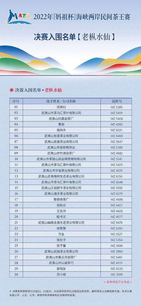 本报讯 记者获悉,经过六天的激烈角逐,由莆田市政协牵头的2022年“妈祖杯”海峡两岸民间茶王赛武夷岩茶决赛入围名单出炉。