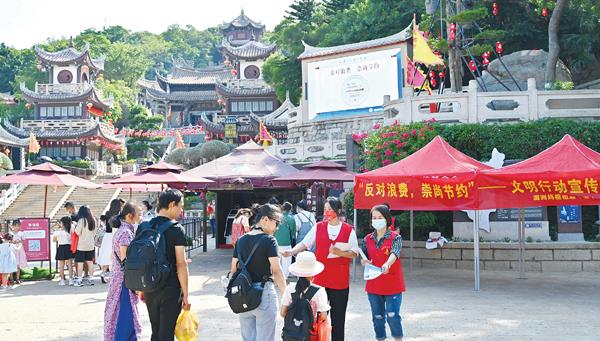 9月11日上午,湄洲妈祖祖庙妈祖义工队在圣旨门广场开展“反对浪费,崇尚节约”文明行动宣传日活动,引导来岛香客、游客及岛内居民养成反对浪费、崇尚节约的良好习惯,营造浪费可耻、节约为荣的社会生活氛围。