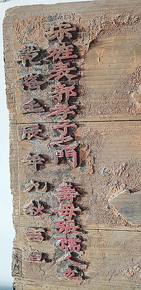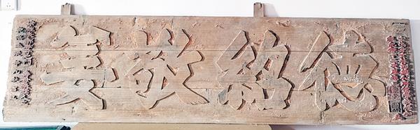 笔者与村民郭桂方先生交流,他为笔者提供一条信息,说郭氏古时有从郭庄分支到今涵西街道涵西社区港头自然村。其见笔者喜欢文史,就带到崇祀堂右帐,参观一块清乾隆三十七年(1772)的古匾,这是他于数年前到本村一户家里看到此匾,动员捐献后,由他送到祠堂收藏。笔者对此匾拍照并量尺寸,古匾长212厘米,宽55厘米。杉木材质。古匾正中刻榜书“德绍敬姜”四大字,上款:“赐进士出身、文林郎、兴化府儒学教授加□级纪录十二次廖连三为”,下款:“宋旌表郭孝子之门、寿母张孺人立,乾隆壬辰年九秋吉旦”。