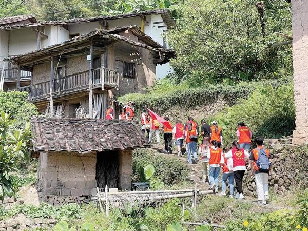 ▲时光小分队攀爬羊肠小道,前往拜访革命“五老”邱春芳。 阮榕/摄