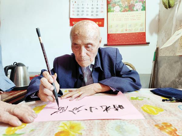 邱老虽年近百岁,仍笔耕不辍,书法墨丰字劲、富有质感,门两侧的春联都是他的杰作,赢得志愿者们交口称赞。应小分队之请,邱老当场题写“时光小分队”五个大字相赠,激励莆院青年学生弘扬红色精神,继续为老区振兴发光发热。