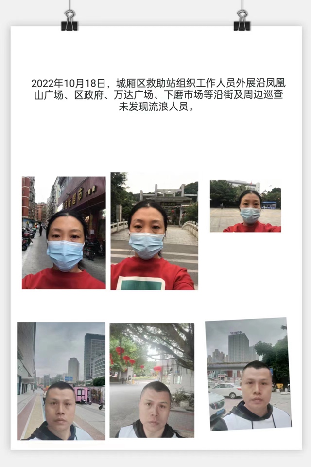 为保障我市流浪乞讨人员等困难群体的基本生活权益,10月18日,城厢区民政局组织救助站工作人员、莆田市上善社会工作服务中心工作人员,在凤凰山广场、城厢区政府、万达广场、下磨市场等沿街、周边及易聚集地开展巡查活动。