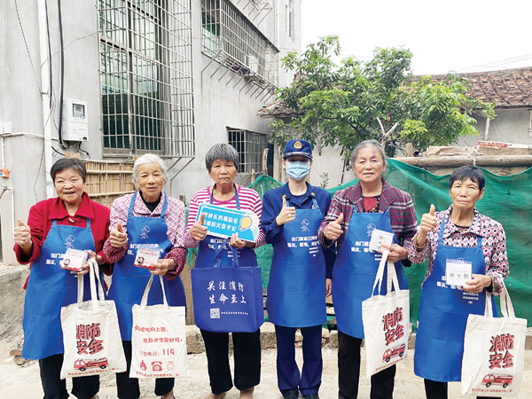 活动前期,大队组建“围裙宣传队”,以身穿定制消防安全围裙的形式走进农村独居老人家中,为他们排隐患、讲平安,以“话家常”的方式面对面向老人传授“防火小妙招”,最后将身上印有消防宣传语的围裙送给老人。