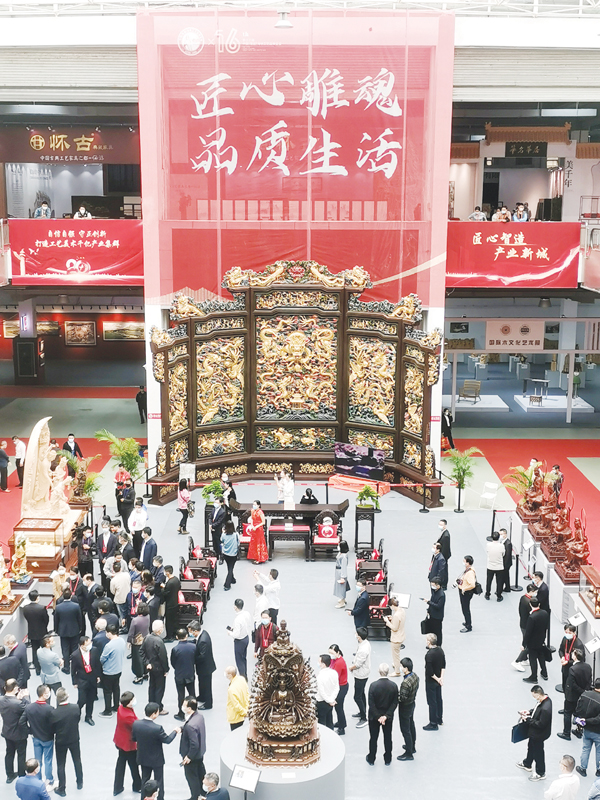 亮点二:凸显匠心制造,弘扬工匠精神。在主会场设置“千年雕魂”主题馆,以木雕为主,涵盖牙雕、竹雕、石雕、玉雕等莆田特色雕刻工艺门类,展现精美作品、展示精湛技艺,体现莆田工艺美术大师世代传承的“千年雕魂”工匠精神。组织设置“木与生活”国际木作作品馆,展出248件来自92个国家的艺术家和青年学生创作作品,推动中国木雕与世界木雕文化交流。同期举办第十三届“艺鼎杯”中国木雕现场创作大赛、第八届中国泥塑造像技艺大赛、2022年“中匠杯”中国工艺美术创意设计大赛3场评奖赛事活动,进一步增强展会创新创意活力,挖掘新作品培育新匠人。