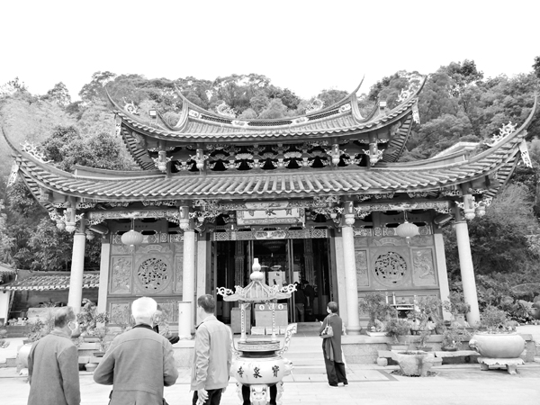 这块有故事的石头在一棵高大的榕树下。在莆田,每一个村落,每一座山,一转角你可能都会遇见一棵高大的榕树,有些村落即使拆迁了也会保留榕树的位置,因为它生命力旺盛,年岁长,大树底下好乘凉,有庇护乡民之吉祥意。眼前的这棵大榕树站在山路旁,宝泉寺(图1)门口,枝繁叶茂,树冠远望像大鹏展翅,见证了一座山的人文内涵,见证了一块石头的传奇故事。