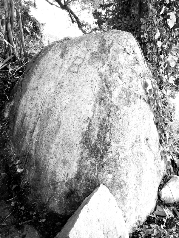 乡贤说的这块石头形似官帽(图2),确有几分像。但它表面看起来似乎并不出众,大山里类似的石头应该不少吧,若不是有文化底蕴的人,大约觉察不到它的出众。