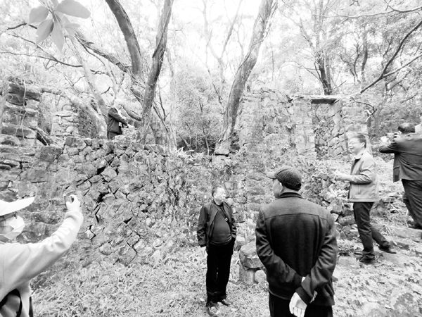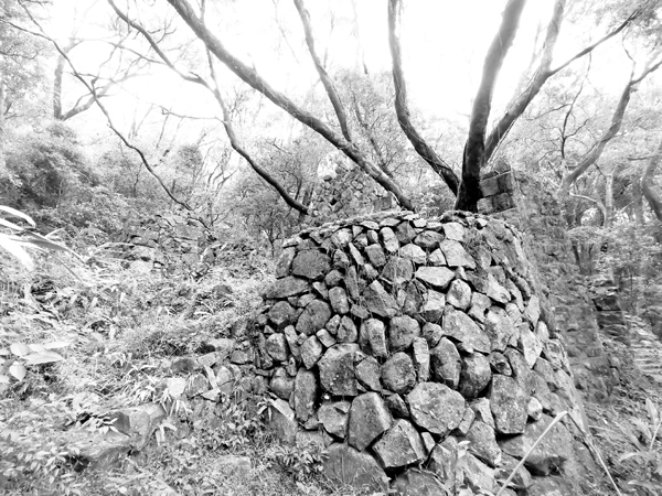 两处摩崖石刻里提及的“清光绪末叶,外国教士借为避暑地”“耶”可见外国传教士来莆传教的历史,果然山林中有几座传教士避暑别墅遗址(图5-6),但见残垣断壁,零星的地基。一块块不规则、不平整的石头垒筑起来的墙在岁月的更替里变成灰黑色,青苔、野草、藤蔓恣意生长。